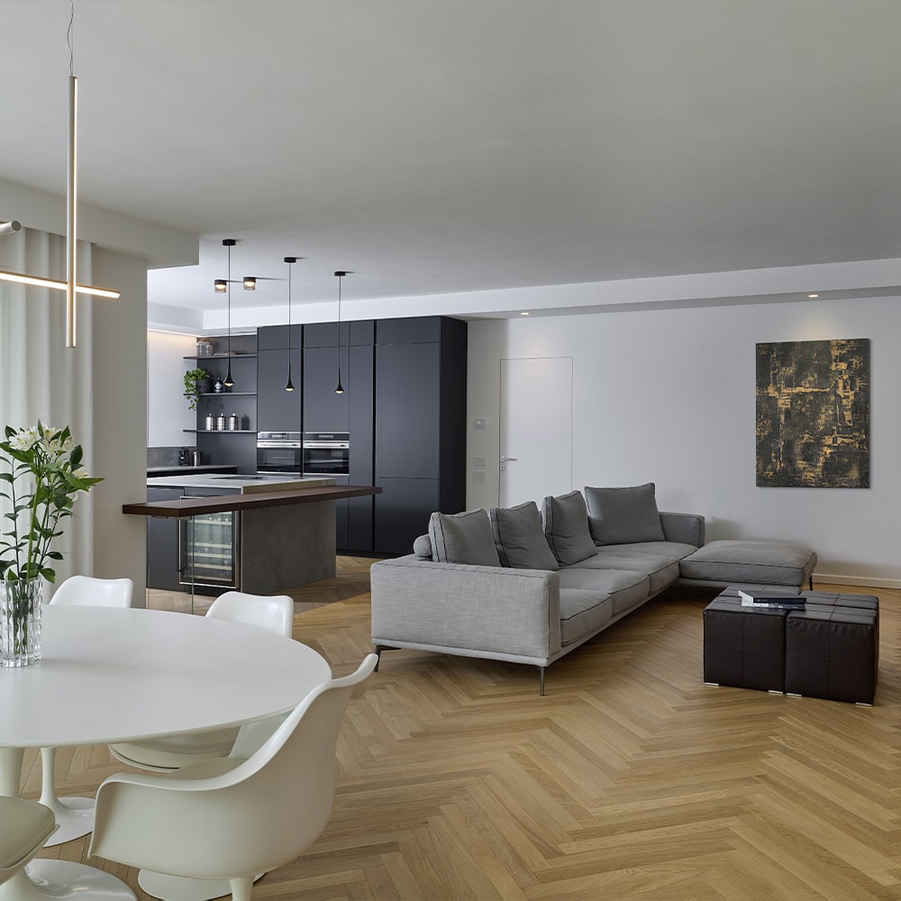 Appena varcata la soglia, lo sguardo corre lungo un ampio open space, ambiente dominato dalla luce naturale che filtra attraverso grandi vetrate schermate da tende leggere. Il parquet posato a spina di pesce conferisce calore e prestigio, accompagnando lo spazio fino alla zona pranzo e al soggiorno con un ritmo visivo elegante e continuo.
