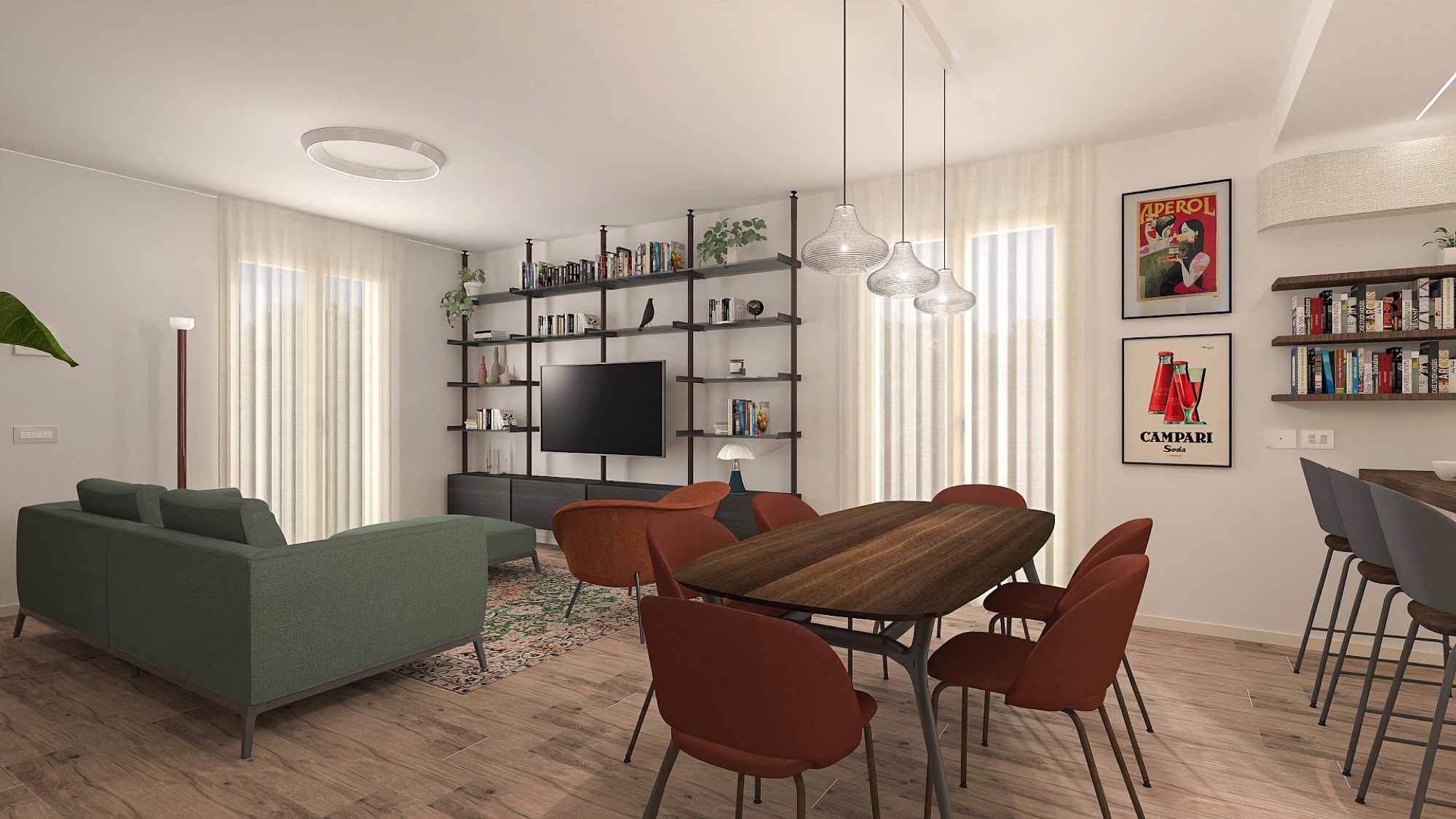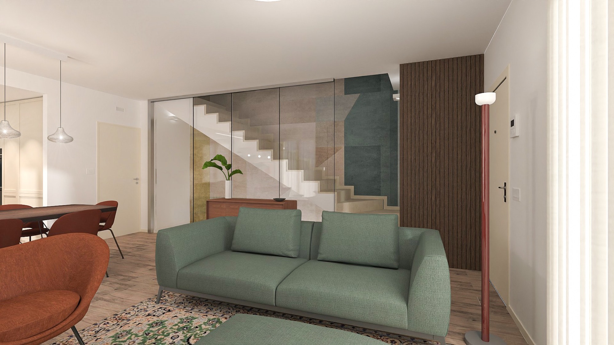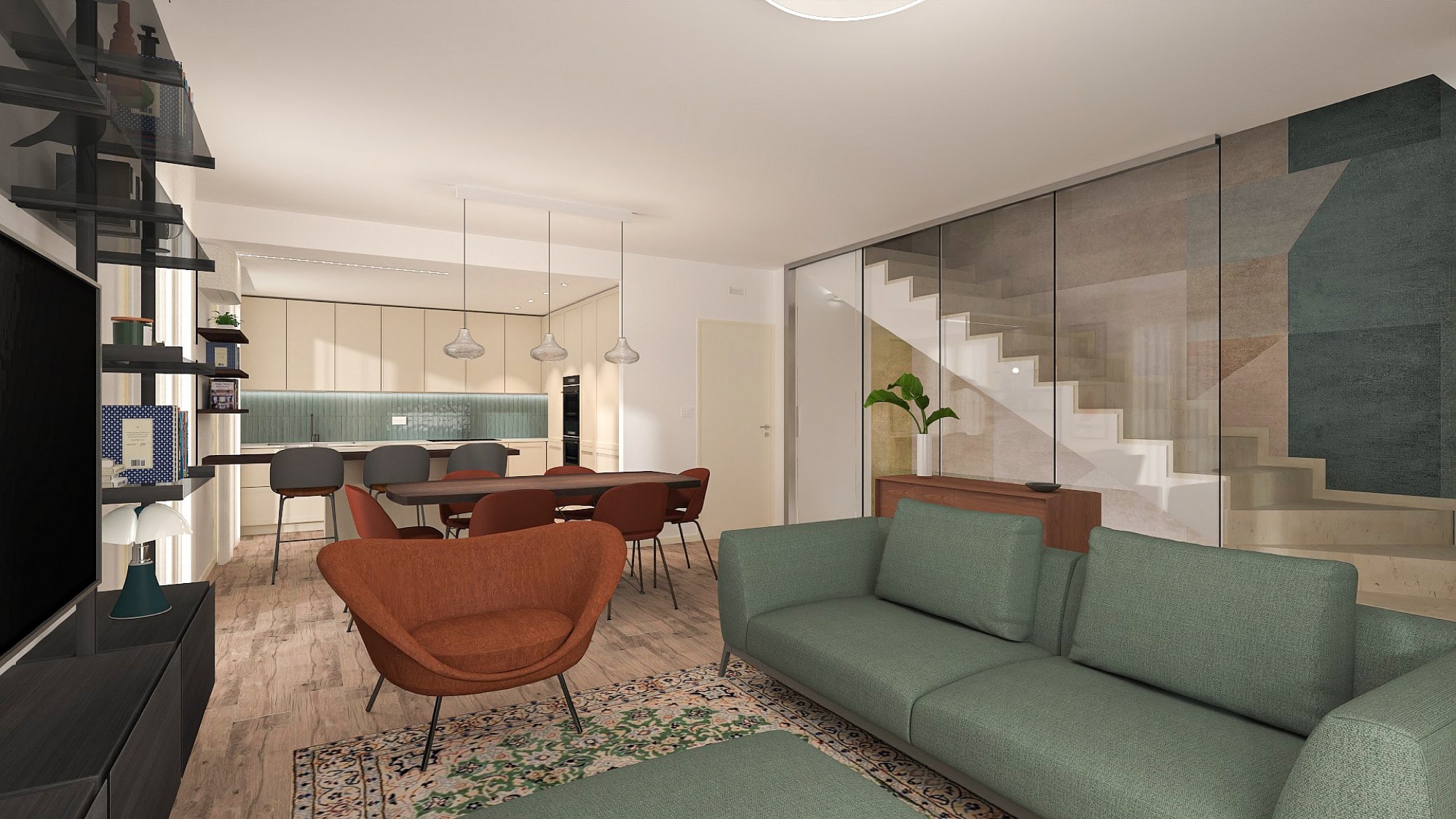 Il living è definito da una base materica calda, con pavimento in legno e superfici chiare che amplificano la luminosità dello spazio. Il divano verde e le sedute terracotta introducono contrasti cromatici morbidi, mentre tappeti e opere grafiche richiamano motivi geometrici che diventano il filo conduttore dell’intero progetto.