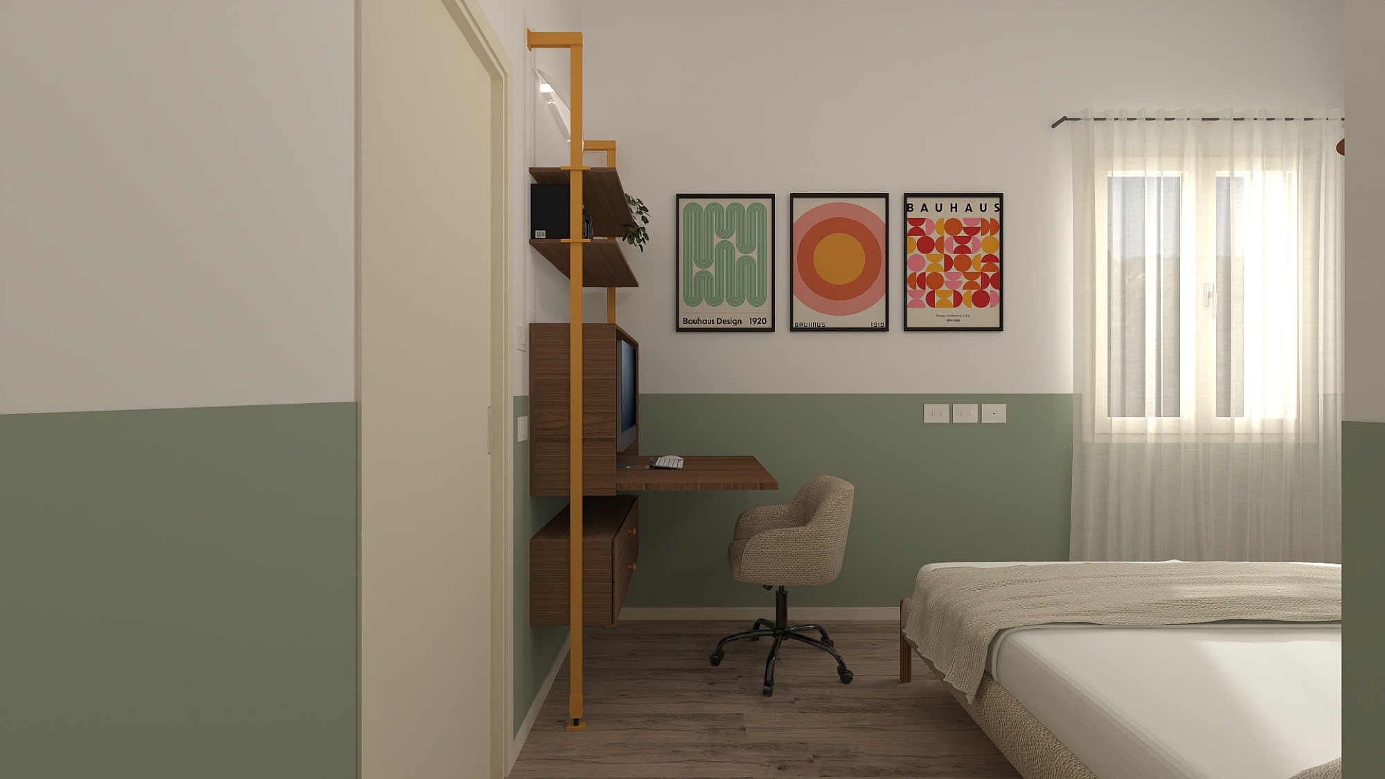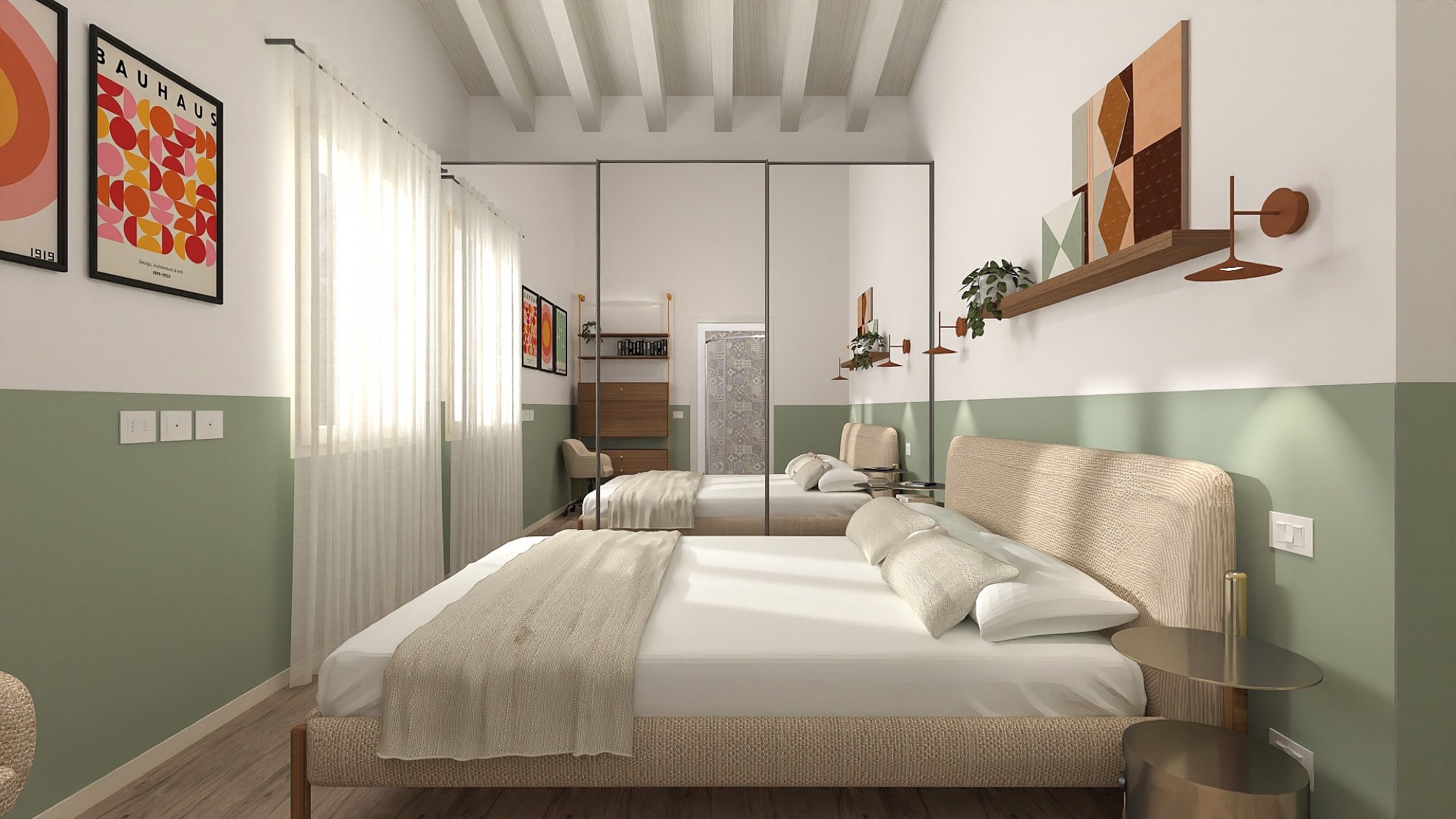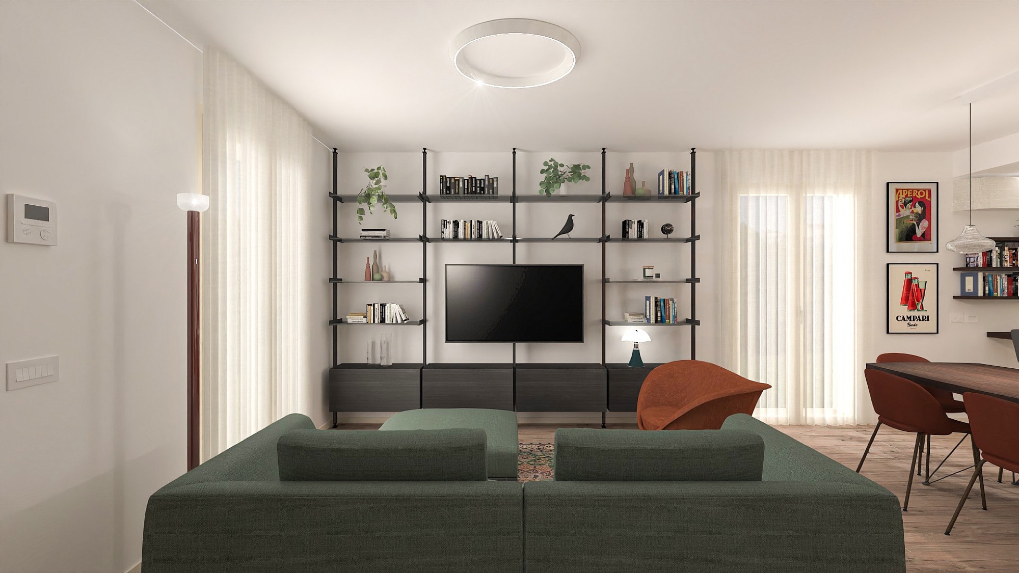 Il living è definito da una base materica calda, con pavimento in legno e superfici chiare che amplificano la luminosità dello spazio. Il divano verde e le sedute terracotta introducono contrasti cromatici morbidi, mentre tappeti e opere grafiche richiamano motivi geometrici che diventano il filo conduttore dell’intero progetto.