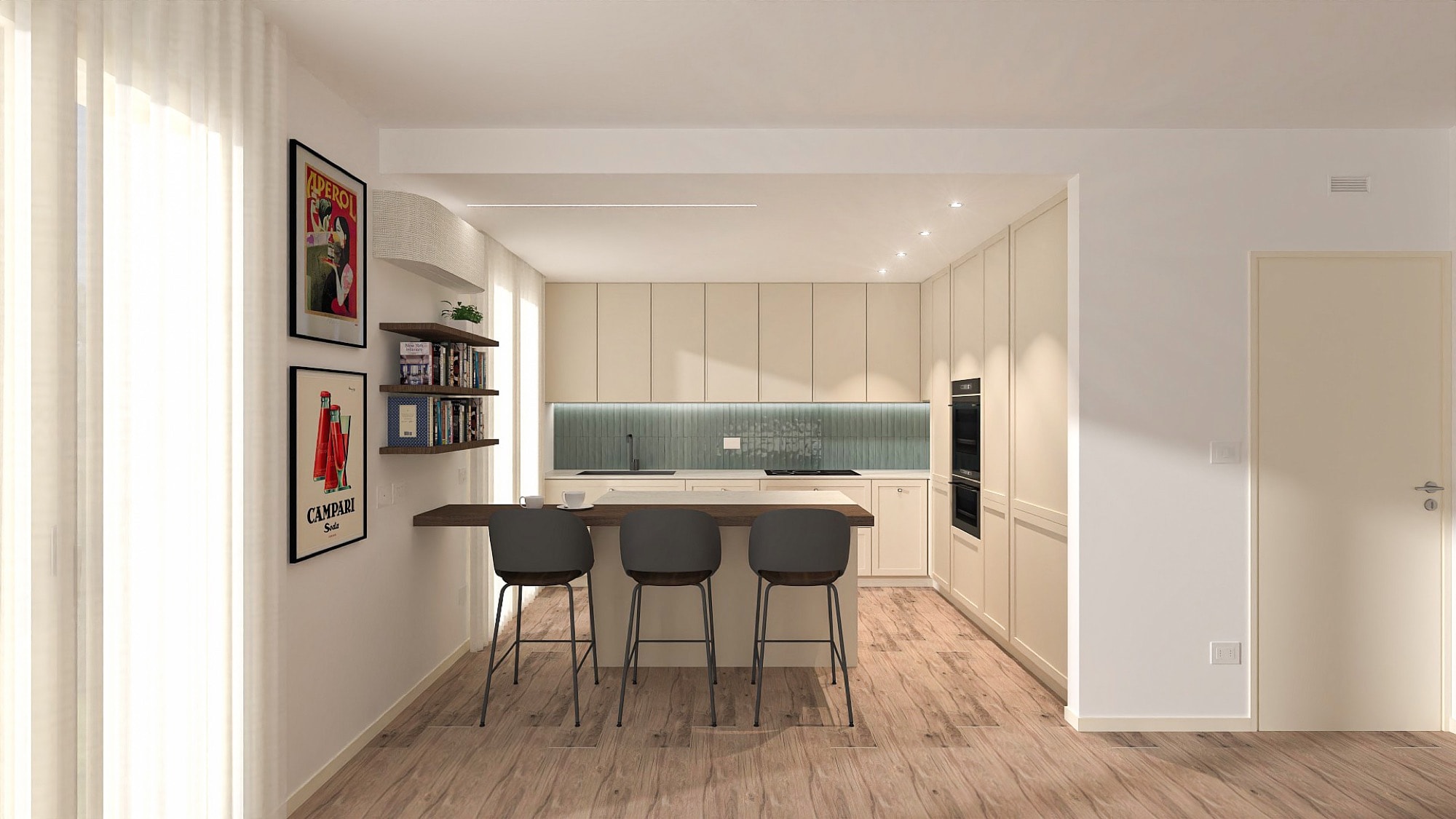 La cucina introduce un richiamo più classico grazie all’utilizzo di ante a telaio e finiture delicate. Le superfici chiare e le tonalità morbide mantengono una continuità visiva con la zona giorno, mentre i dettagli degli arredi conferiscono all’ambiente un’eleganza discreta e senza tempo.