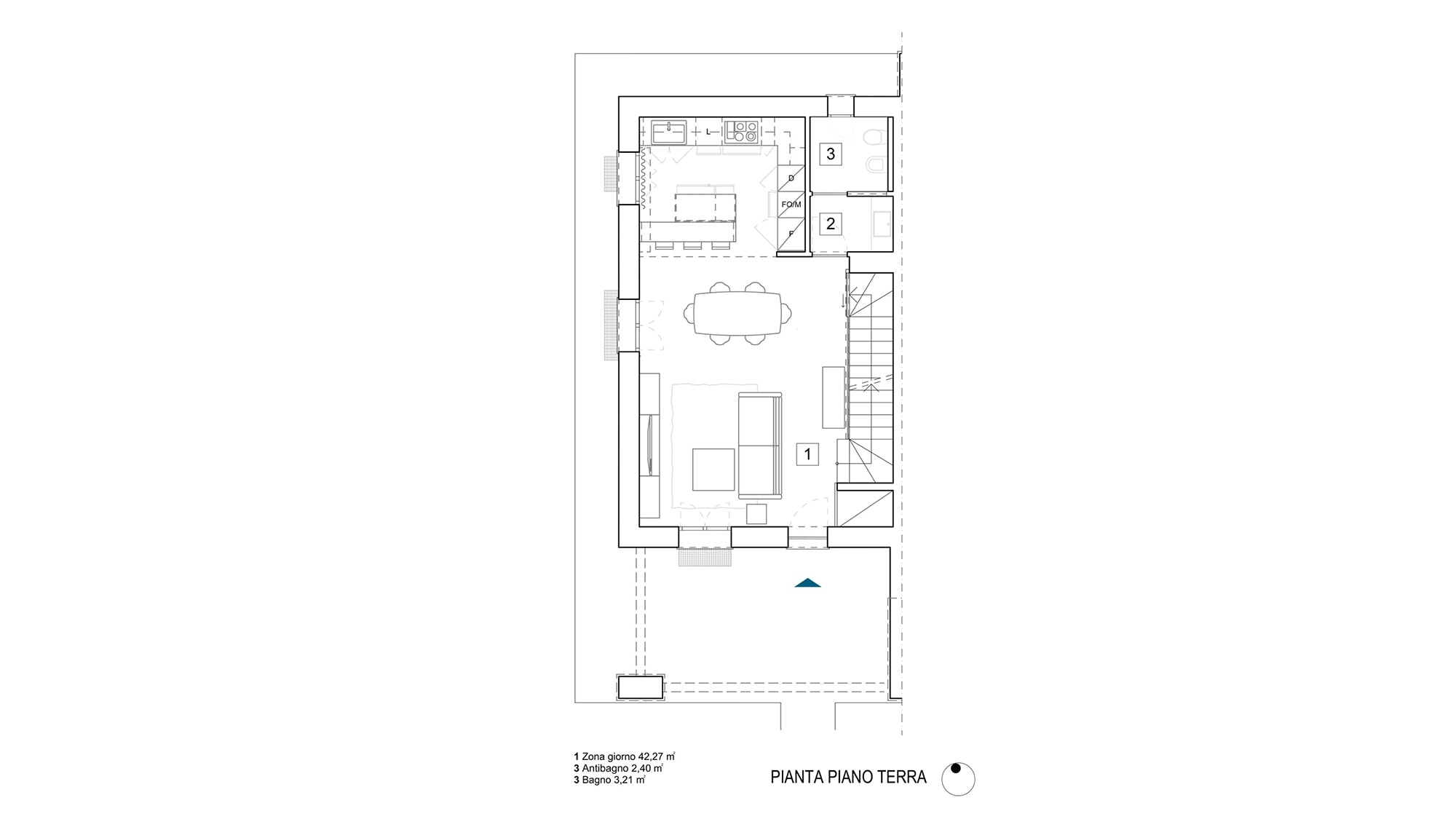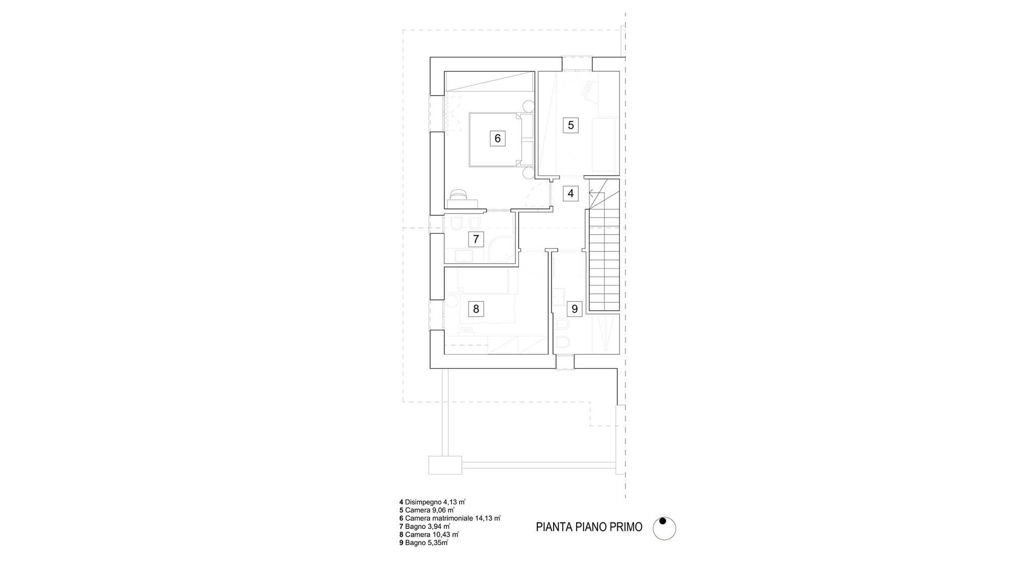 La scala diventa un elemento architettonico centrale grazie a una parete decorata da un motivo geometrico, realizzato attraverso un gioco di tonalità a contrasto. Il disegno, ritmico e dinamico, accompagna lo sviluppo verticale dello spazio trasformando la parete in un elemento scenografico che rafforza il tema delle geometrie presente in tutto il progetto.